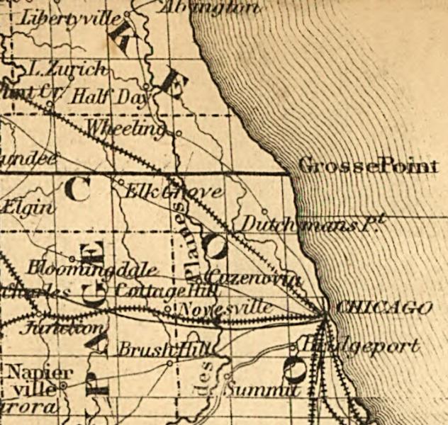 2 Andreas, A.T., History of Cook County Illinois from the Earliest Period to the Present Time, (Chicago, 1884) (“Andreas Cook Co.”) at 417, 467. See “Railroad and County Map of Illinois Showing Its Internal Improvements,” (Ensign, Bridgman, & Fanning, New York, 1854). Neither “Ridgeville,” Lake View, or Evanston are shown, only the geographic “Grosse Point” on the lakeshore.