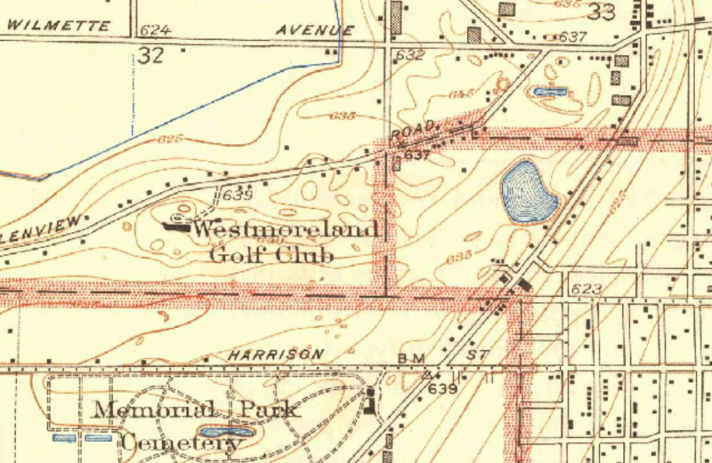 Gross Point was a part predecessor to Wilmette, not Evanston. In 1924 and 1926, Evanston did annex two small parcels on its northwest borders, which included almost all of the small remainder of the former Village of Gross Point that had not been annexed by Wilmette, i.e., north of Central and west of Gross Point Rd., where Lovelace Park now is. Back then the area was not residential, but was dominated by a former quarry that had filled with water. Right: Detail from a 1928 U.S. Geological Service topographical map.